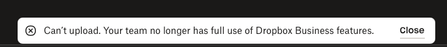 Error "Can't upload. Your team no longer has full use of Dropbox Business features.