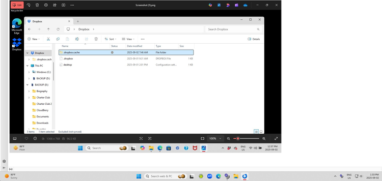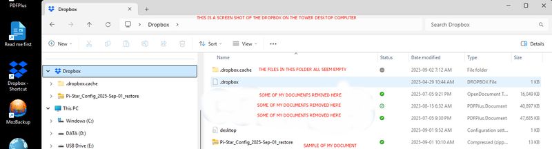 Thank you for the reply. When I open the dropbox application on the LapTop, the first thing I see is a dropbox folder, It contains a sub-folder called .dropbox.cache. also in that first folder there are files identified as .dropbox , and a .desktop. file. It contains a few lines of unidentified text,