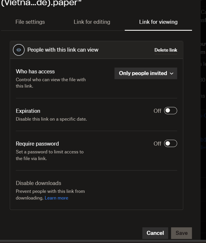 If you can, please select the “Can view/edit” option next to their name and check if there’s a “Remove” button, as well. If there is, you can remove their work Dropbox account from your Paper doc, so that they can access it from their personal account instead.