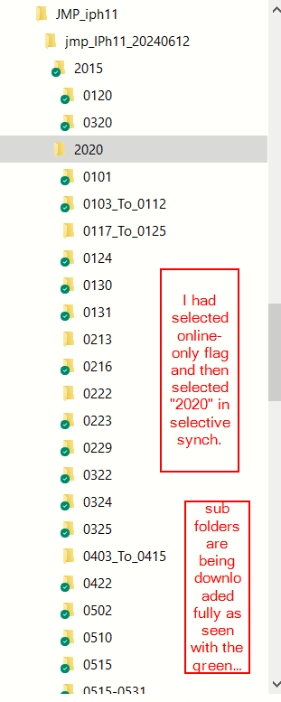 So, just to confirm, when you're checking folders through your selective sync settings, instead of "online-only", they sync to your computer as "available offline" and are taking up hard drive space, is that right?