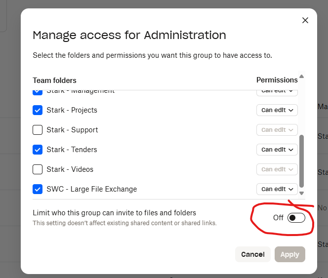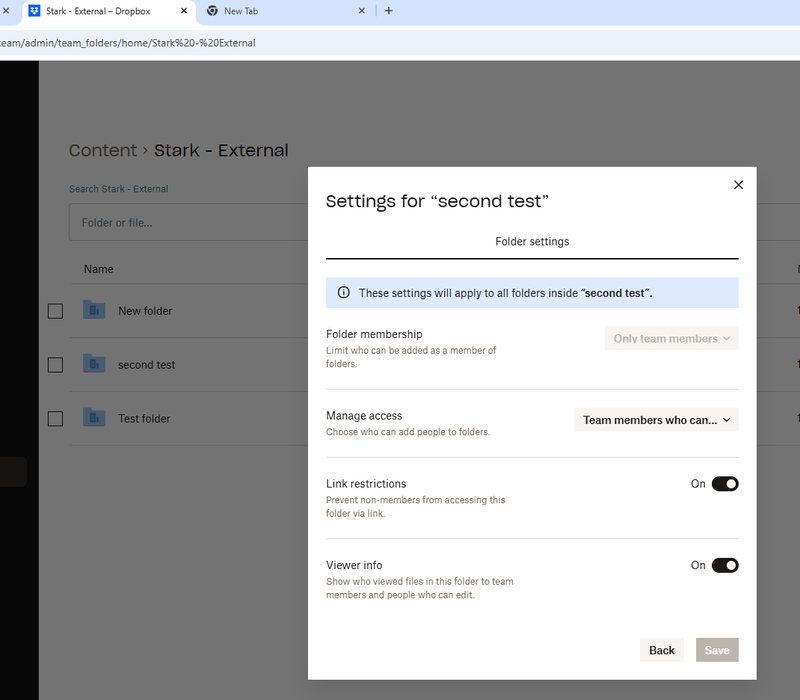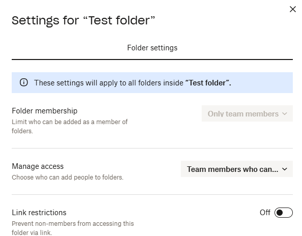 However, the folder itself shows that folder membership is restricted to team members only (see below) and the dropdown is greyed out - i cannot change it. So no matter what i do, i cannot add an external users email address to the folder as it always gives me the error 'this email isn't in your team'.