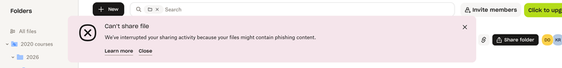 Won't let me share my own files due to apparent phishing content? I need to copy and share links to my folders and files in order to share to clients and I keep getting an error message saying you have interrupted my sharing activity. Any help would be appreciated to get my account unlocked from sharing files please.