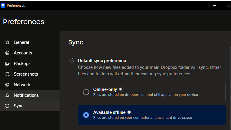 I set my sync preferences to offline but Dropbox keeps downloading the pictures with 'Available when online' as the default: