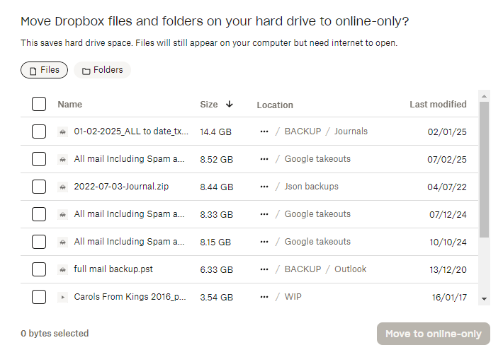 If I right click on the dropbox folder itself, I get the same triad of options as shown above. If I click on individual files, I get options for sharing and a choice to "make online only". - Hannah5 months ago