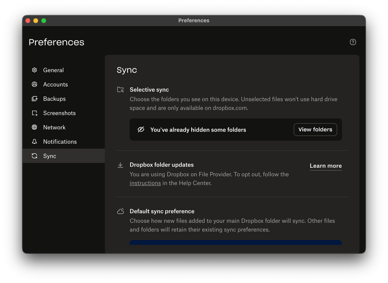 It says I am using Dropbox on File Provider and I cannot see the option that will allow me to point it to the external drive. I had previously done so in the past with no problems, till the update to macOS Tahoe when suddenly the link to the external USB-C drive was severed. It worked for a while as I have sufficient space on my 1TB and I did selective sync. Now, I am running out of storage space, I appreciate guidance.