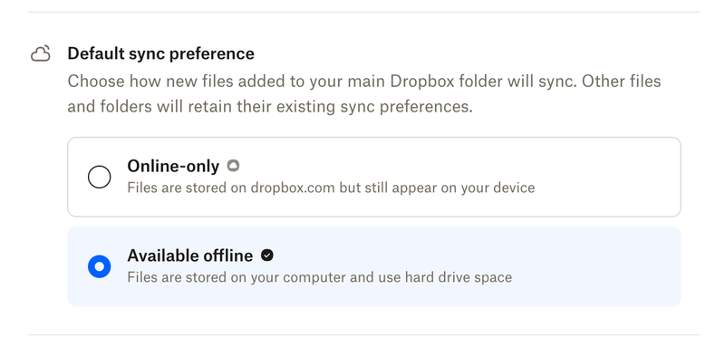 Setting up a new Mac. I've a Dropbox with a few 100 GBs worth of stuff, I want 99% available offline at all times (not short of storage on the new Mac). Selective sync set up to exclude a few folders.