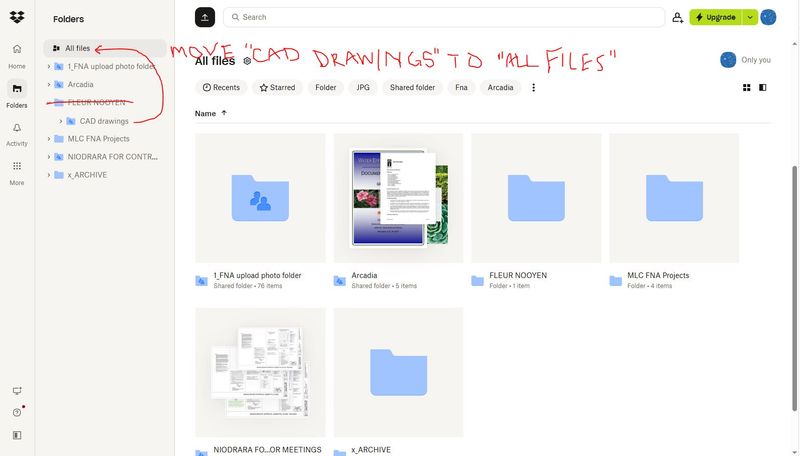 Having said that, would you mind clarifying what happens if you visit your account online, then access your "Fleur Nooyen" folder, and then grab the "CAD drawings" folder, and drag it on the "All files" path that you see right above the folder's title, above "Recents" and "Starred"?