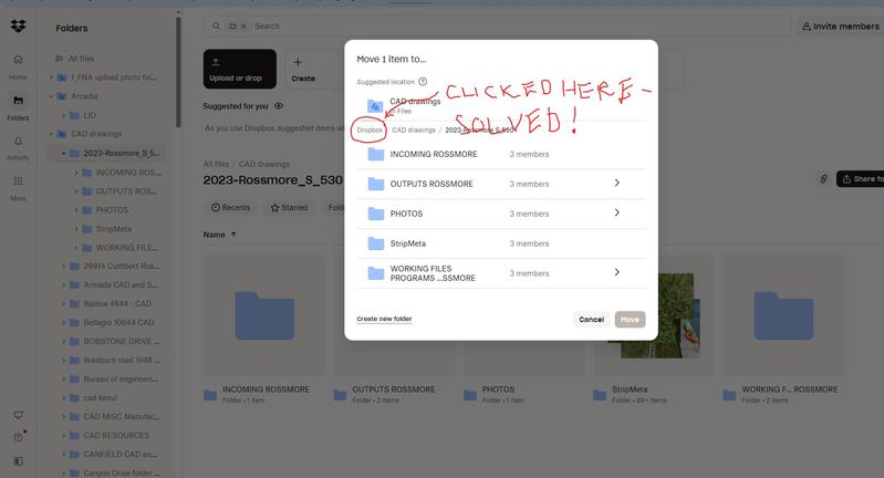 I'm OCD and decided to create a folder specifically for a client's projects. The problem is we use AutoCAD and XREF linking, which breaks the link/xref everytime a different team member opens the file, because we have a different file path. I've tried many times to move the folder back into the main DropBox "All Files" parent folder from dropbox.com and Windows Explorer, but it doesn't allow me to do so. I've also tried removing my permissions, deleting the undesired parent folder called "Fleur Nooyen" and then reinstating my permissions, but it automatically recreates the undesired folder. I have editing permissions and was able to move it into the folder "Fleur Nooyen" folder, so it's odd that I can't move it back out of said folder. I've attached a screenshot for reference.