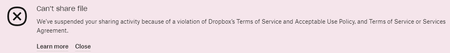 Just to provide some context, I’ve been using my Dropbox account since the early days, back in late 2008 during my university/college years, so it’s been around 15 years now. I’m not aware of why the sharing activity has been banned on my account, and I can’t recall receiving any email notifications about it.