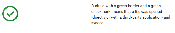 Regarding the white circle with a green border and a green checkmark, it means that the file was in in an online-only state and by opening it (either directly or through a 3rd party app), it changed states and now it's available.