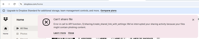 I am trying to share a file and get the message "We’ve interrupted your sharing activity because your files might contain phishing content"