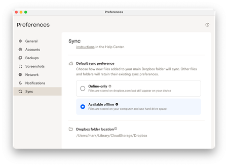 Hi, I just upgraded to Dropbox on File Provider which uses the native MacOS file sync APIs. I like my files stored locally, so I changed the Default Sync Preference to Available offline.