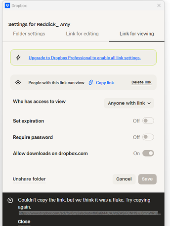 When I do any of these, I can find a 'Viewing link' but it says it can't be copied but to 'try again because we think it's a fluke," DB says. This has been every time I try it. What am I doing wrong?