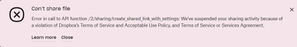 "Sharing was suspended due to a violation of Dropbox's Terms of Service".