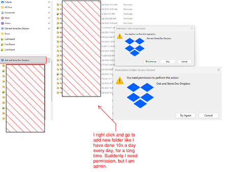 Hello, suddenly, I am unable to create a new Dropbox folder in File Explorer. It says I need permission. But I've always been able to do this. I have all my dropbox folders in file explorer and can w...