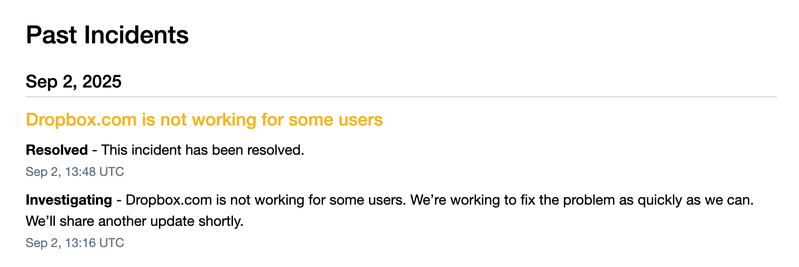 Here is the status page for Dropbox: https://status.dropbox.com/. There haven't been any incidents in August, but if you experience this issue again please let us know ASAP and we'll investigate further.