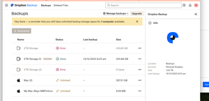 As for your capacity, while you might have unlimited space to backup your computer, your Dropbox space (the place outside the backup folders, which is for the rest of your Dropbox files) is not unlimited.