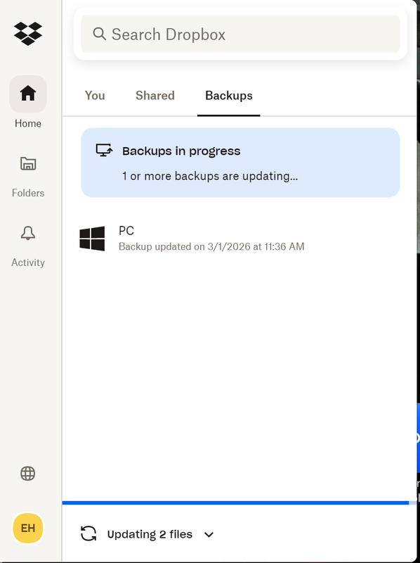 I clicked Backup and in the Dropbox app on my computer, it says a Backup was updated on 3/1/2026 at 11:36 AM. But, when I looked at Dropbox online, all of the folders were 0 bytes.
