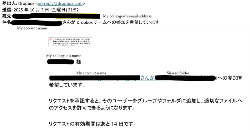 Hello. I received an email from my colleague saying that I had requested to join a specific Dropbox shared folder. However, I never sent such a request myself.