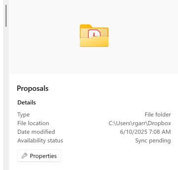 It appears that only folders are showing the circular arrow icon. If I drill down on the folder, it seems that all of the files have the green checkbox icon in the status column. In the details window of Windows File Explorer under "Availability Status" for the folder displaying the circular arrows it says "sync pending." This seems odd as all files and subfolders appear to be synced. Below is a screen shot of what happens when I click on the Proposals folder.