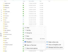When I right-click on those files/folders with that icon and chose the Dropbox options, I only have three (make online-only, view on Dropbox.com, or manage hard drive space) or six options (copy Dropbox link, Tranfer a copy, Make online-only, View on Dropbox.com, Share, and Manage folder access). I should state I have have plenty of space (343 GB of free hard drive space), and I want the file/folder available offline. I do not see that option.
