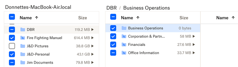 But when I go into Dropbox Sync options on my computer, I don't get the option to sync all of them that I have access to. Although it shows "Business Operations", there are no folders showing within it (and there are many of them that exist online). Also, the bottom 2 folders that begin with "z. " do not show up at all.