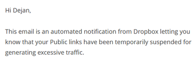 i'm dropbox user now since 2012 and never had problem with it. Now 5 days ago (5.1.2023) my public links were temporarily (says) suspended for generating too much traffic.