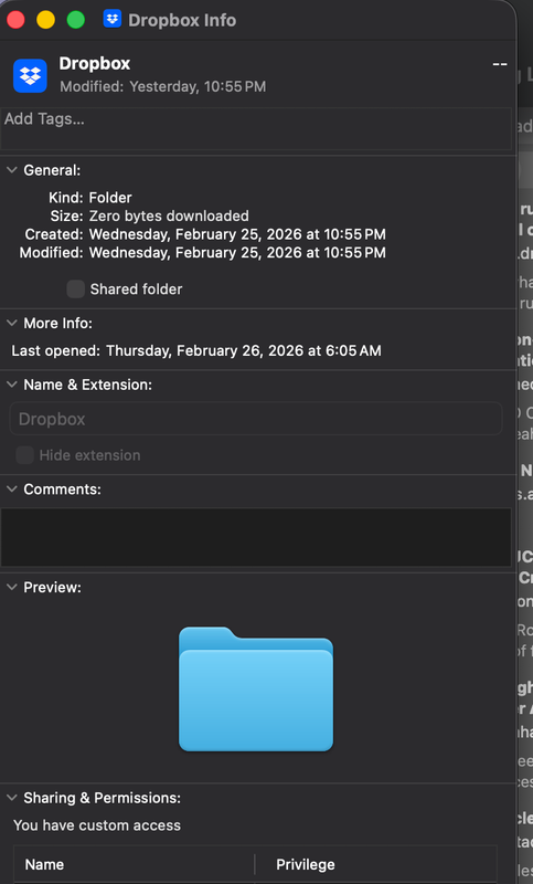 Device MacBook Air M3 Operating System/Browser (if using the web) MacOS Tahoe 26.4 Dropbox App Version (if using the app) 243.3.6895 Syncing Status Fully sync'd no folders visible indexing Qu...