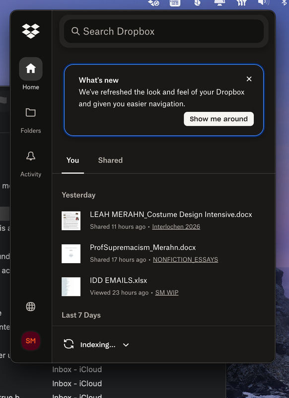 The Dropbox desktop app is stuck at indexing after a MacOS Update to 26.4