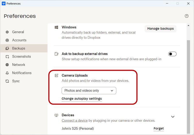 Here's how the Dropbox is configured on the S25. I've basically turned on everything.