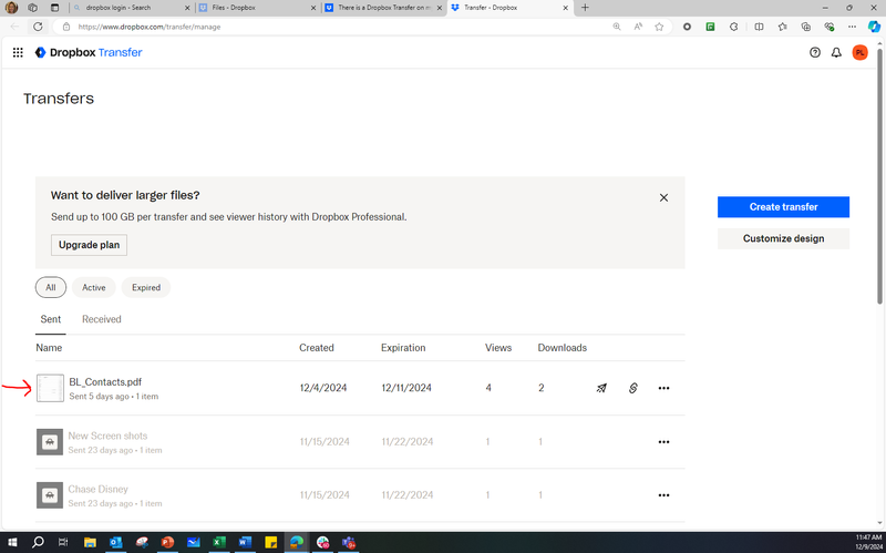 Here is screen shot the one with the arrow is the one I did not create. I did not create that file or create the transfer? It is a list of my husband's phone contacts