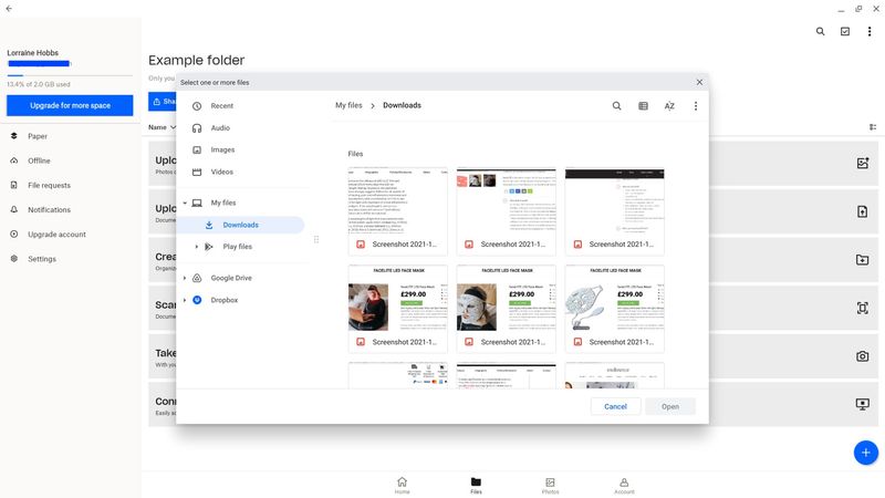 I have been using Dropbox for a while now to create folders and then transfer my pics into them from Google photos. When i create the folder in dropbox i have always taken the option to upload files and it would them show photo as an option to take so i could select and upload. I tried this today and it will no longer let me access google only the files that are on my laptop? Can anyone help, i have not changed any settings or anything? Please bear in mind when replying to use Dummy mode