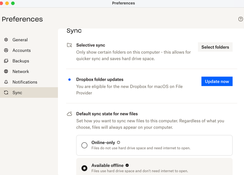 I have gone to Dropbox Preferences, then clicked Sync and then checked Available Offline - but still all my "zero bytes" files remain on line and don't download until I click on them.