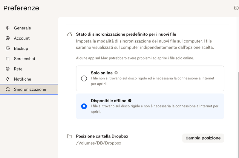 Potresti indicarci la posizione attuale della cartella Dropbox come mostrato nella scheda "Sincronizzazione" nelle preferenze di Dropbox?