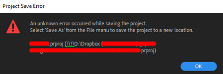 "Unknown Error" when saving an Adobe Premire Pro project directly into a Dropbox folder