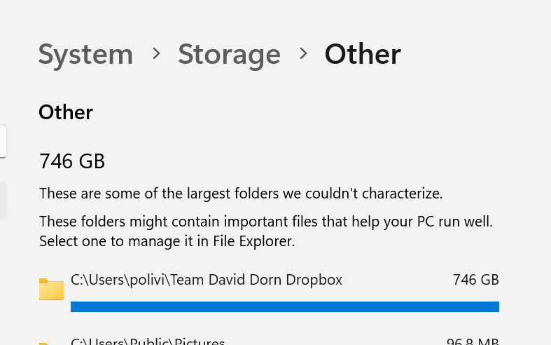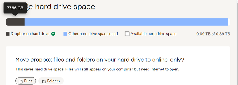 I tried both of them... indeed files are not visible anymore, but my hard drive is still full. An interesting thing is that dropbox itself report an usage of 77GB (image 1) while Windows report Dropbox-related files to be taking up 746 GB