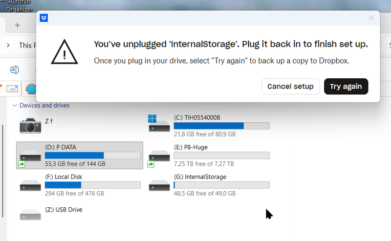 W11 Dropbox sees My Nikons & USB once connected. Not Neo storage that's perfectly usable in Explorer
