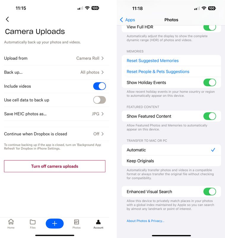 I have been using Dropbox for a long time. It worked I never had to change anything from my initial setup. On going from Windows 10 to 11 my camera uploads changed from .jpg to .heic.