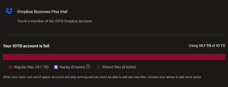 Recently Dropbox messed up with the storage quota report. Not to mention it always create a duplicate of my current folder when joining a team that's causing it to double up the size but even after I deleted the duplicate folder, I still cannot sync new files because the reported quota won't update at all and still says the account is full even though it's not. This is quite frustration.