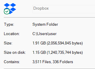 2. Also, after receiving a warning for hitting 1.9 GB, over the past few days I moved a bunch of very large files out of Dropbox. "Properties" of the Dropbox folder on my computer (File Explorer) seem to reflect this, sort of, with "size on disk" having been cut down to 1.15 GB: