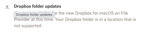 But then I set up a new Mac mini M4 with an external home folder on SSD. My Dropbox does not want to go to CloudStorage any longer; Dropbox preferences on that computer says I am NOT eligible to macOS on File Provider because my DB folder location is not supported. I am on APFS but not encrypted. The only thing that seems missing is encrypted.
