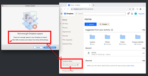 Everyday I get this (see screenshot) on Mac Os when connecting any device to sync photos. "Not enough dropbox space" - Mac - But I have PLENTY of space.. and I see it on both of my macs but not my ip...