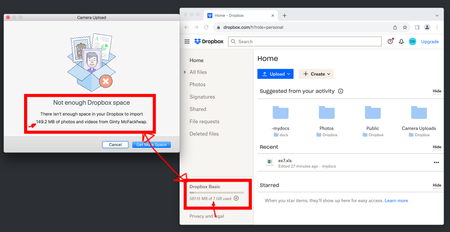 Everyday I get this (see screenshot) on Mac Os when connecting any device to sync photos. "Not enough dropbox space" - Mac - But I have PLENTY of space.. and I see it on both of my macs but not my ip...