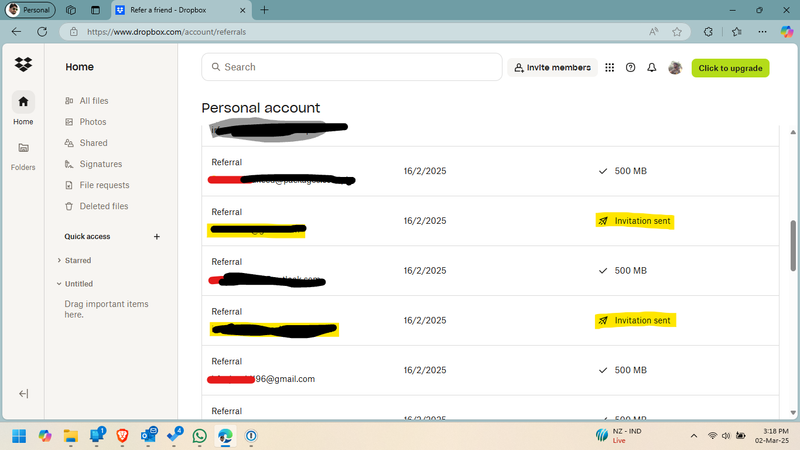 I have refer Dropbox to my friends on 16th Feb 2025, mostly all are accepted and make a new account on Dropbox and install app. I got bonus space as well but 2 accounts are followed all steps but my referral page showing that "invitation sent". what is the process to get that bonus space? please help