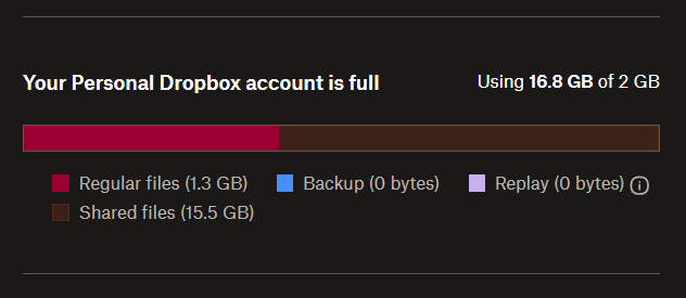 Dropbox indicates I'm out of space, but that's only true if you count things shared with me. That user has already paid for the space. Requiring all users to "buy-up" based on shared space feels exploitative - a rent-seeking practice where Dropbox collects payment multiple times for the same stored bytes.