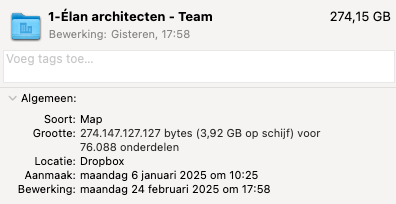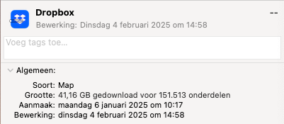 Dropbox is set to online only. The info of the dropbox folder shows a size of 41,16GB which could be correct.One of the subfolders has a size of 274,15Gb (3,92Gb on disk).