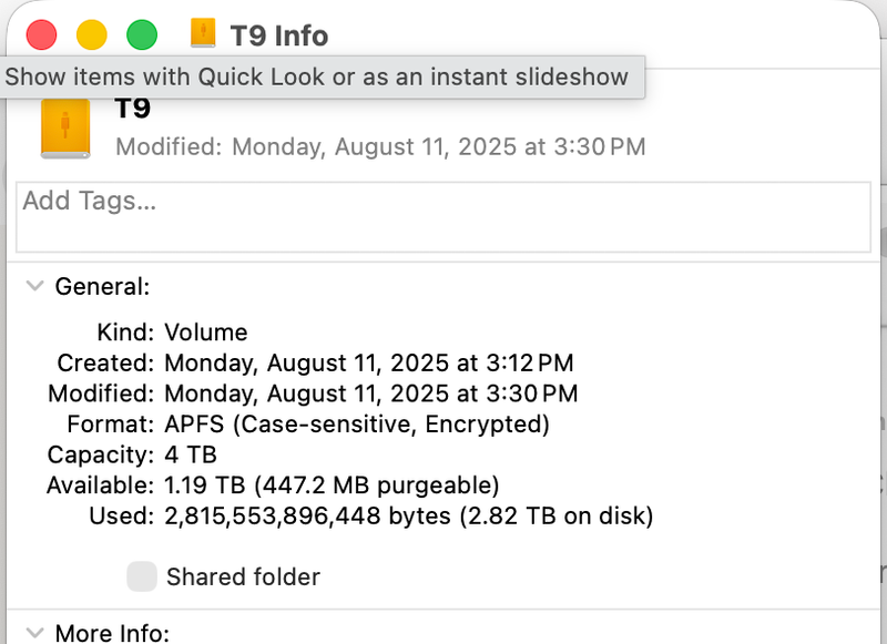 My Dropbox folder is on a 4TB external SSD. There is nothing else on the drive. The physical drive has 1.19 TB of available space.