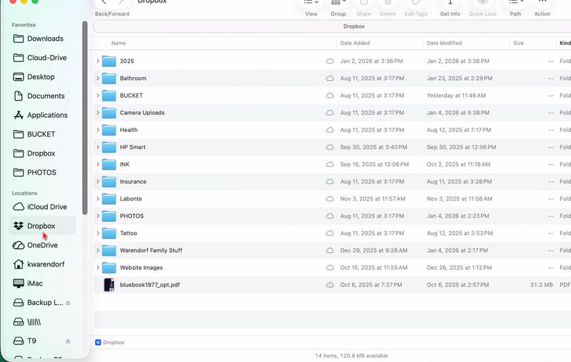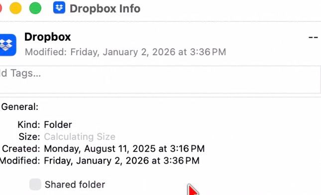 Hi - I’m going to send 3 images. The first is the Get info screen you requested. It never gets beyond calculating size. The second is the full Finder screen of the Drop Box folder, note the data info at the bottom. Last image is the Finder screen of the actual drive. Note that Dropbox is the only thing on the drive and also the data info at the bottom.