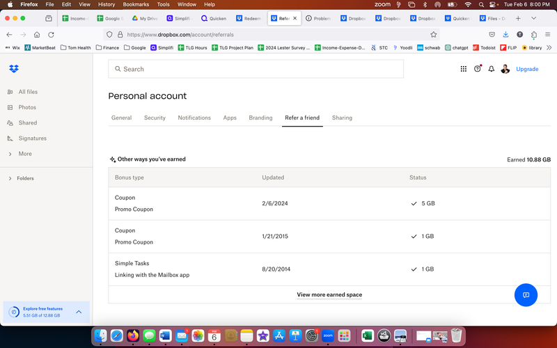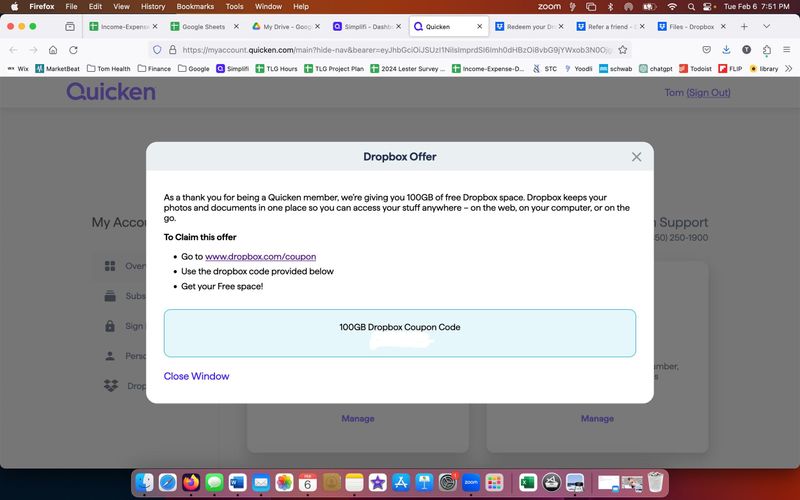 Quicken has given me a coupon for 100GB of free Dropbox space. In the notice, they directed me to navigate to https://www.dropbox.com/coupon and to enter the code they've provided.