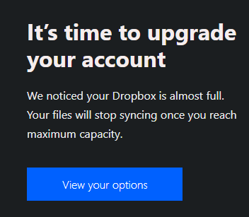 Got an email with the subject "Storage space critical: Kitty, please review your options"